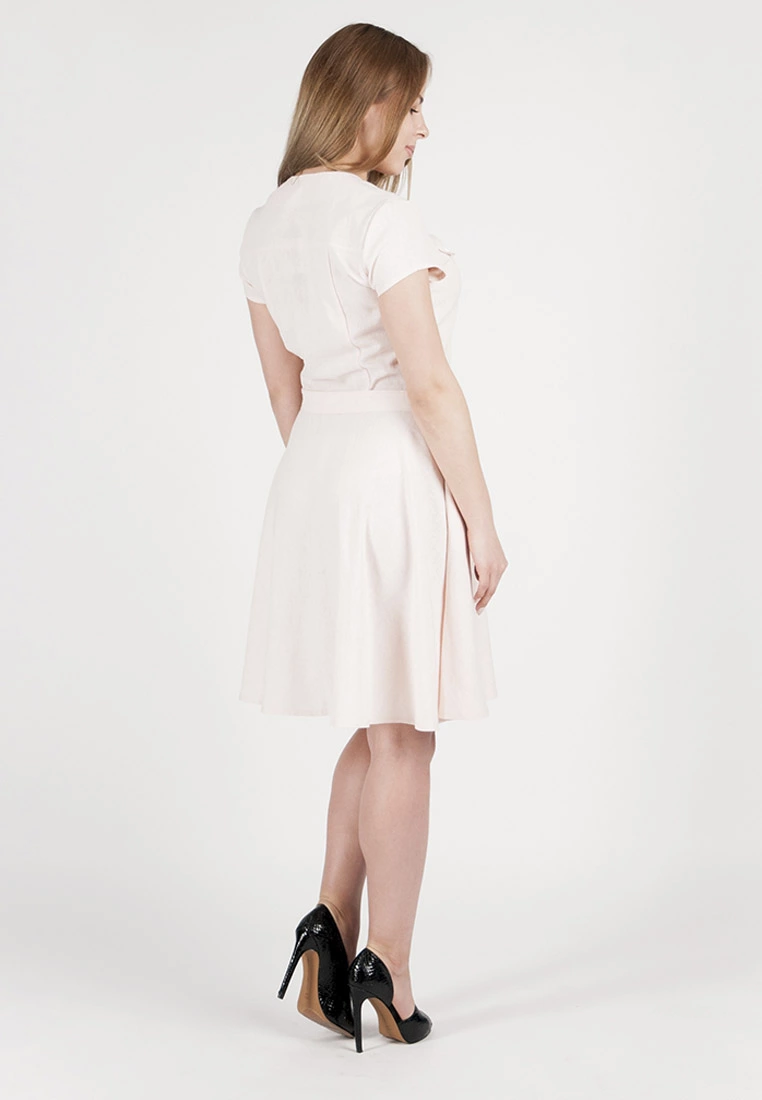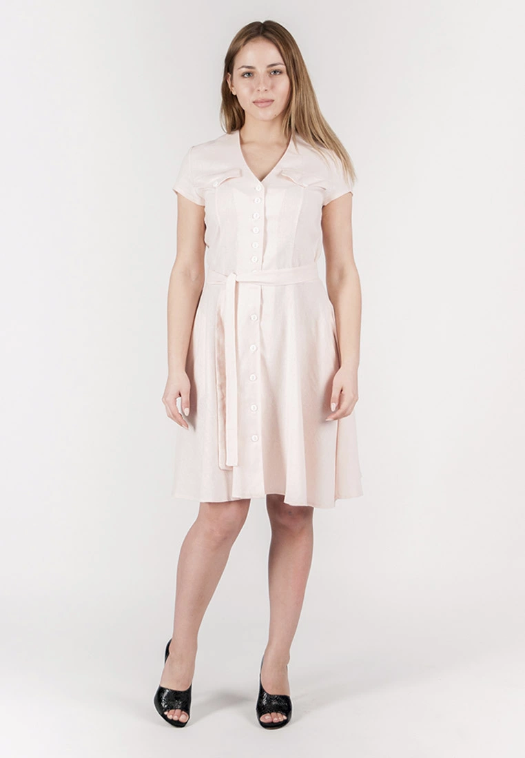 Женское платье из натуральной ткани, впереди застегивается на пуговицы. Отрезное по линии талии, в боковых швах расположенны карманы.
