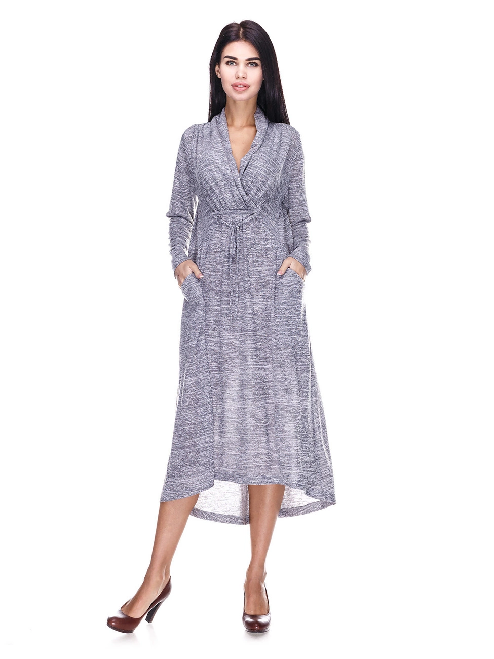 Платье с асимметричным низом, свободного кроя. На полочке расположен декоративный подрез и рельефы в котрых расположенны карманы.