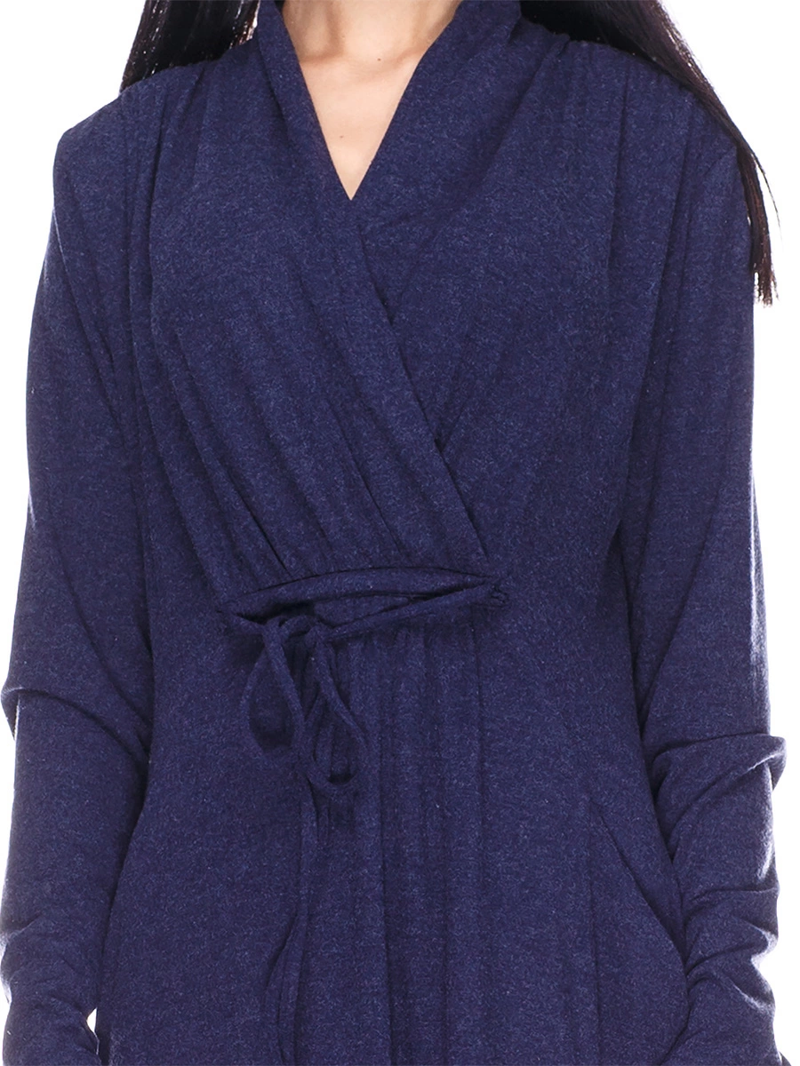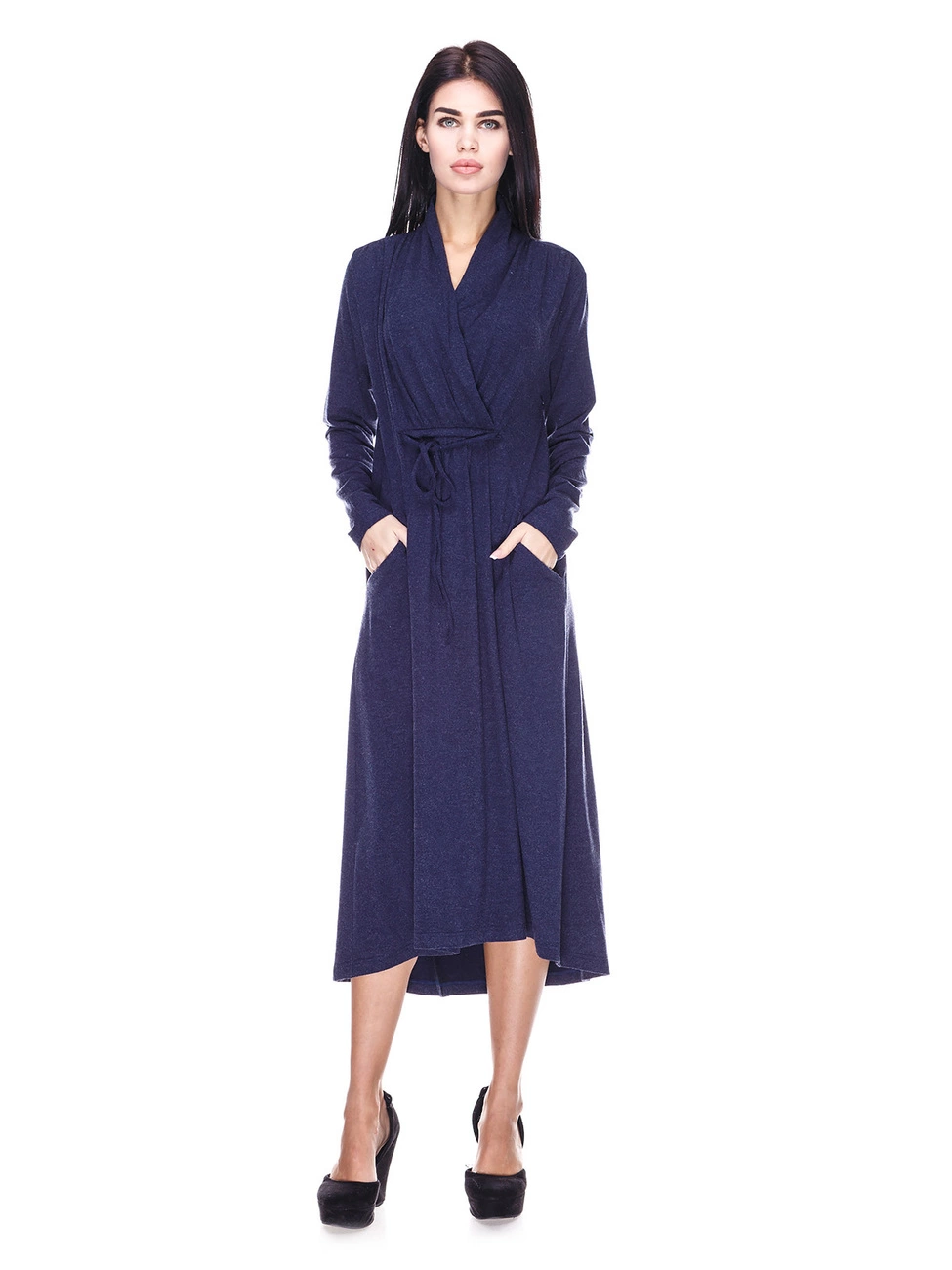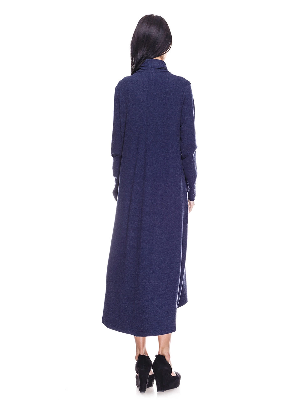 Платье с асимметричным низом, свободного кроя. На полочке расположен декоративный подрез и рельефы в котрых расположенны карманы.